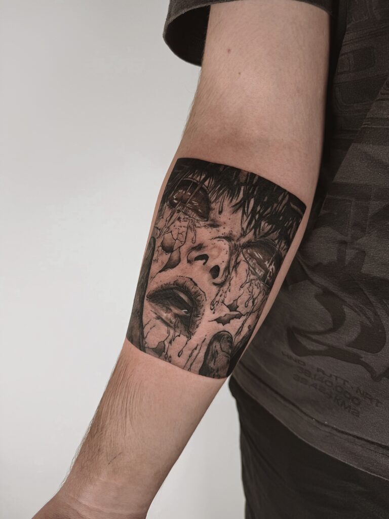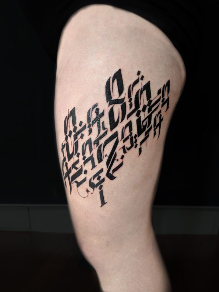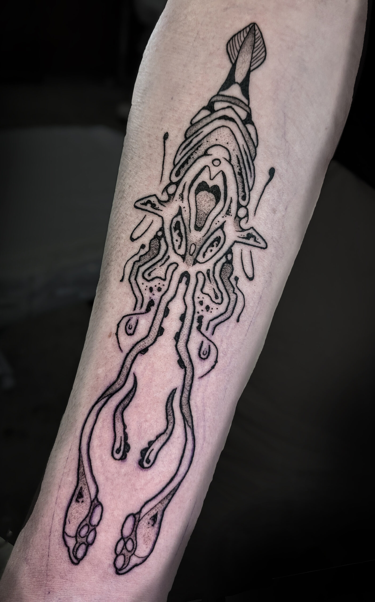Paul’s tattoo style is a natural evolution of his illustration roots: surreal drawing, bold textures, calligraphic ornaments, and experimental blackwork. You’ll find themes of nature, ritual, and sci-fi tech woven through his flash, and he’s especially keen to grow into large-scale illustrative, abstract and custom lettering work.