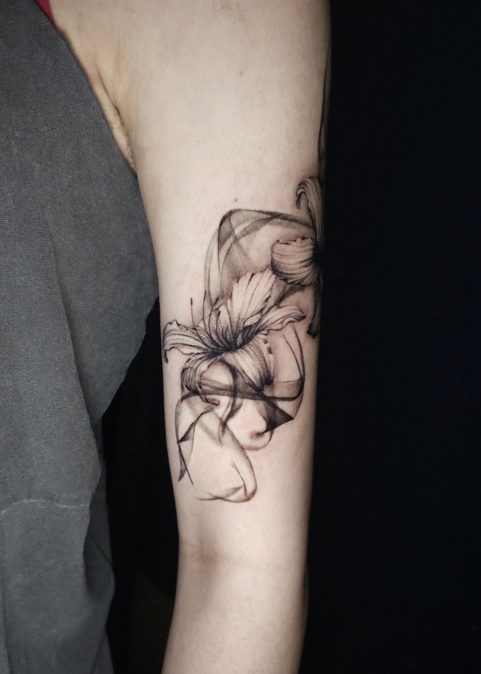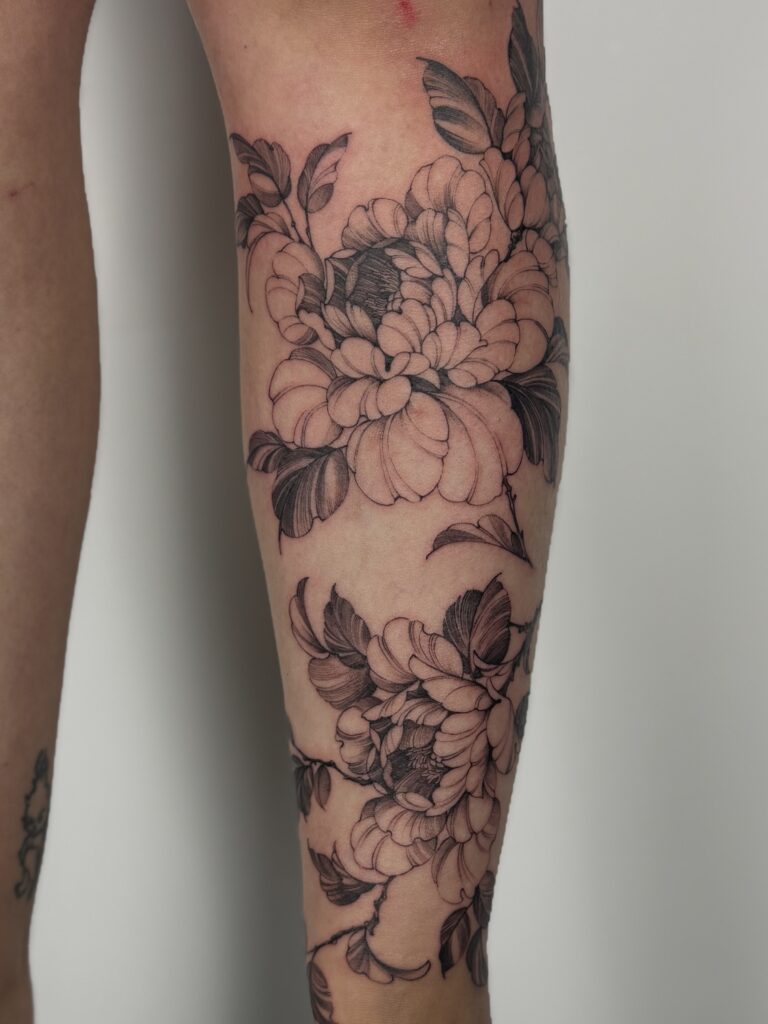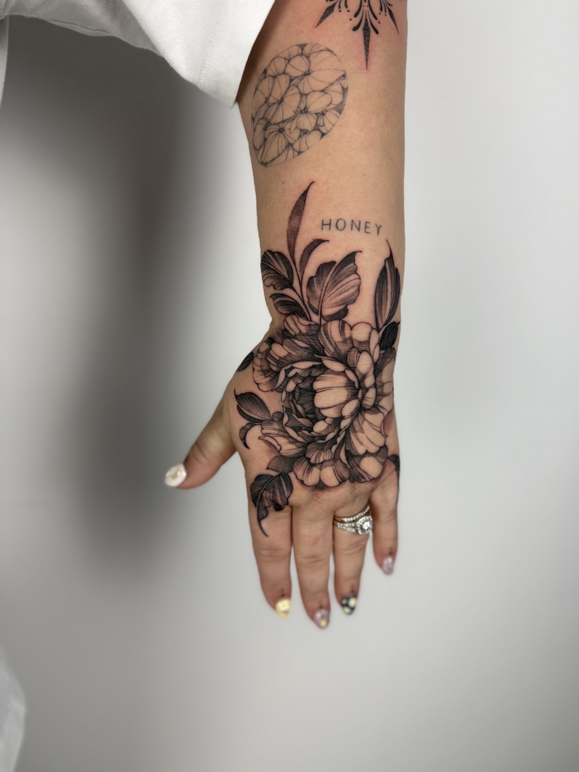 Now, three and a half years into her tattoo journey, Hollie is honing her craft with a focus on fine line work and micro realism, capturing the beauty of faces, florals, and ornamental designs. While she loves the delicate details of her current style, she’s eager to expand her horizons with larger pieces, drawing inspiration from surrealism, Greek mythology, and Art Nouveau.