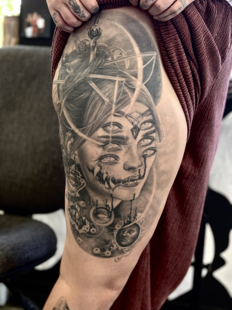 Kyle specializes in a variety of tattoo styles, including realism, surrealism, Japanese, and Chicano. His meticulous attention to detail and commitment to quality have earned him a loyal following among clients who appreciate the artistry and passion behind each piece.